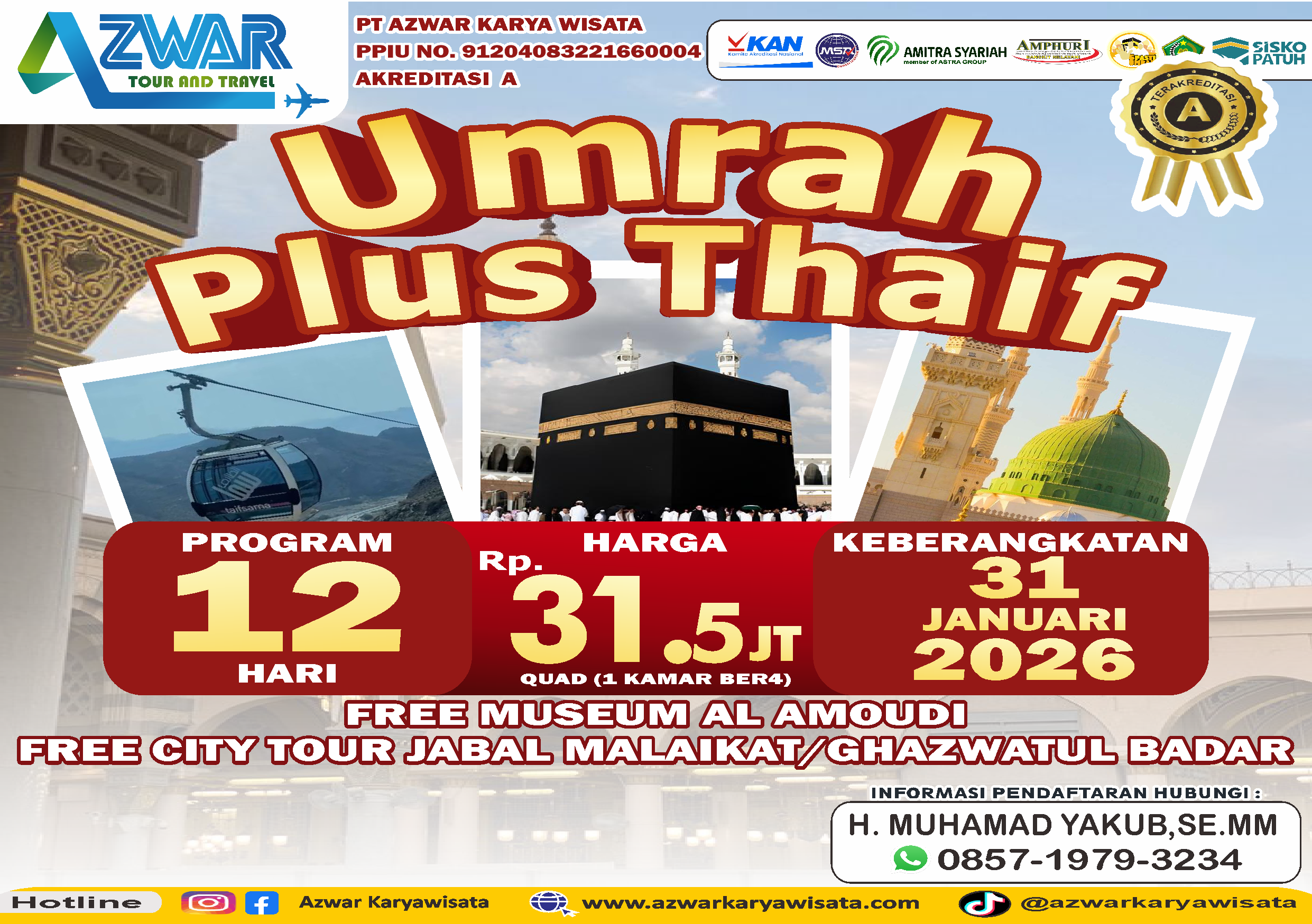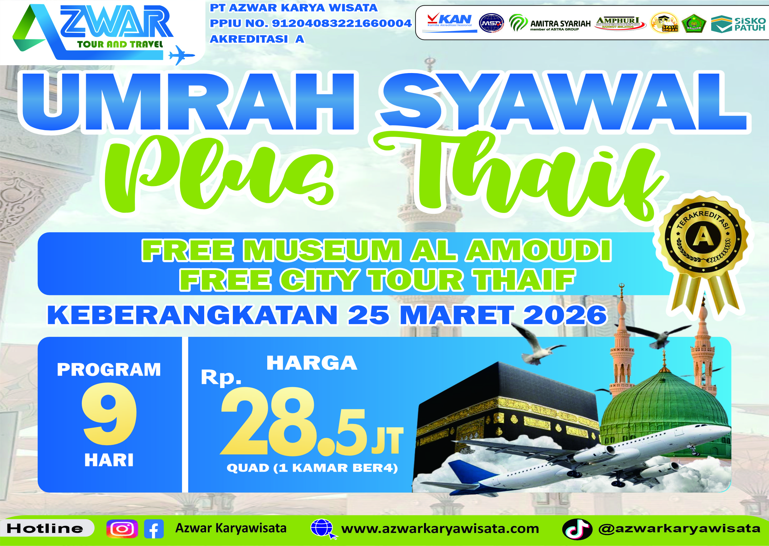 Assalamu’alaikum Wr, Wb Halo Sahabat Azwar Karya Wisata😇 Bismillahirrahmanirrahim ✨UMRAH REGULER✨ PAKET 9 HARI PERJALANAN KUOTA TERBATAS!!! QUAD : Rp. 27.900.000,- 🗓 Keberangkatan : 19…